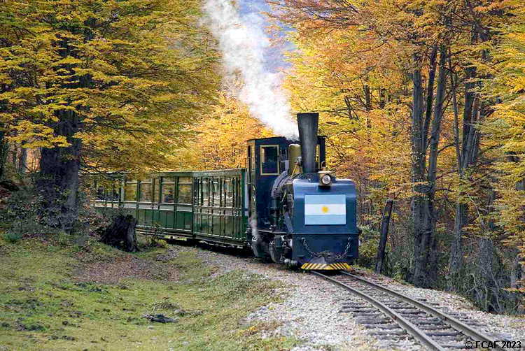 Argentina Argentinas jernbanehistorie begynte i 1857 da et britisk firma fikk i oppdrag å bygge og levere materiell til landets første jernbane. Sporvidde var ikke spesifisert, og britene valgte å bygge med en sporvidde de allerede var kjent med fra kolonijernbanene i India, 1676 mm (indisk bredspor). I perioden fram mot utbruddet av 1. verdenskrig kom også andre utbyggere inn, og dermed også andre sporvidder. Jernbaneutbyggingen nådde sitt høydepunkt i 1914. Etter det har Argentinas jernbaner fristet en høyst omskiftende tilværelse og omfatter i dag (2025) en samlet lengde på ca. 2.500 mil, hvorav bare ca. 1.830 mil er i drift, for det meste kun godstrafikk. Persontrafikk er med få unntak begrenset til nærtrafikk rundt de større byene. Ting tyder imidlertid på at dette nå kan være i endring. De argentinske jernbanene er hovedsakelig delt i tre helt adskilte nett med hver sin sporvidde: meterspor (1000 mm), normalspor (1435 mm) og indisk bredspor (1676 mm). I tillegg finnes det noen isolerte linjer med tertiærspor (750 mm), feltbanespor (600 mm) og en turistbane med 500 mm sporvidde. El Tren del Fin del Mundo (Toget ved verdens ende) I byen Ushaia på Ildlandet, helt sør i Argentina ble det i 1909 bygget en 2,5 mil lang feltsporbane, FCAF, for å bringe forsyninger til byens fengsel, samt å frakte tømmeret som de straffedømte hogde, fra skogene og ned til havnen. Banen ble bygget og drevet av fanger fra fengselet. Etter at fengselet ble nedlagt og gjort om til marinebase i 1947, fortsatte marinen å drive banen, fram til den ble nedlagt i 1952. I 1994 ble banen gjenåpnet som turistbane, men nå med 500 mm sporvidde. Alt materiell til turistbanen er nybygd med den nye sporvidden eller innkjøpt utenfra og tilpasset. Banen har fortsatt sitt gamle navn, FCAF, i behold, men betegnelsen El Tren del Fin del Mundo ble lansert sammen med gjenåpningen i 1994 og gjenspeiler banens status som verdens sørligste jernbane.
