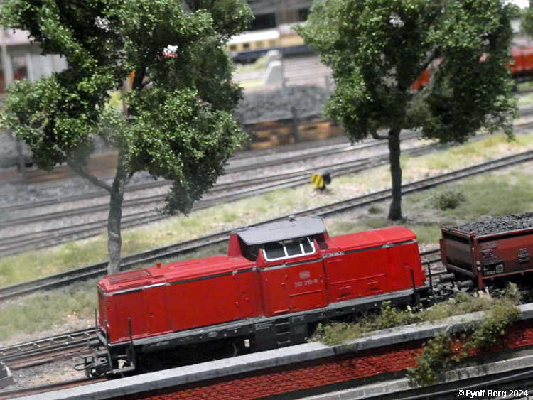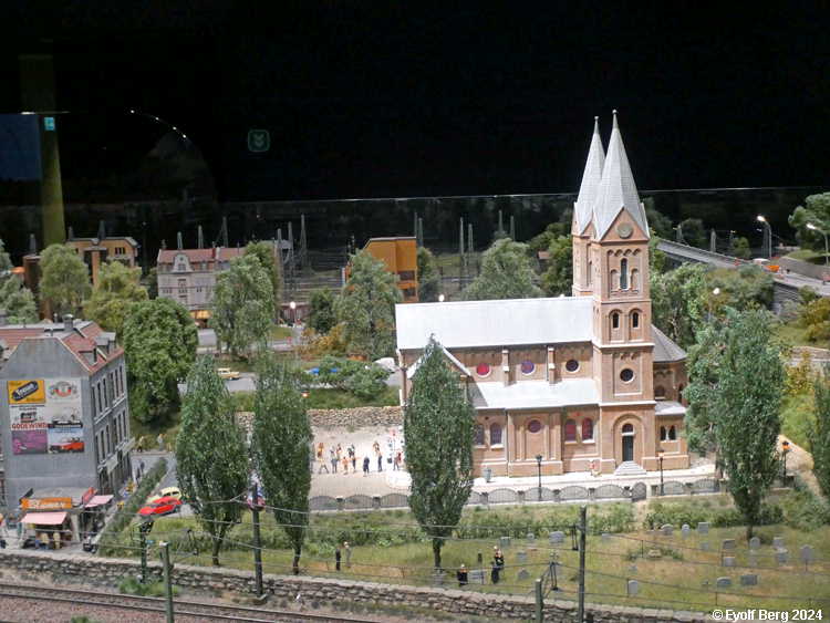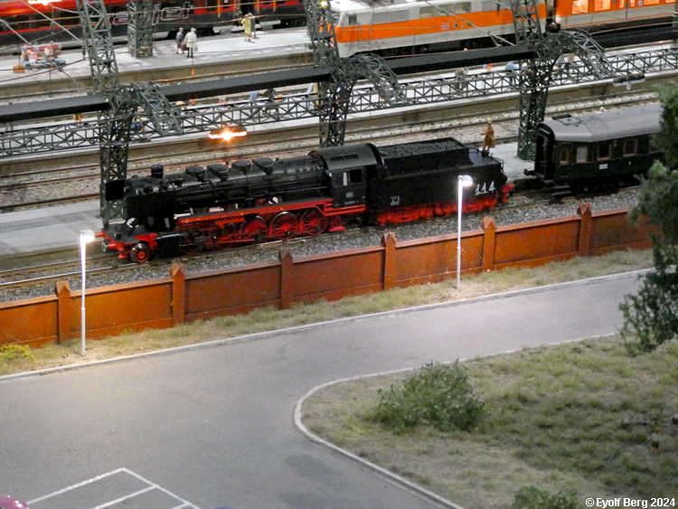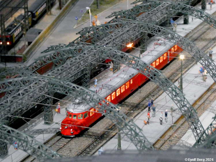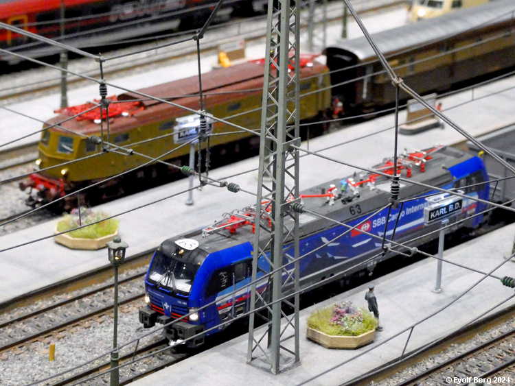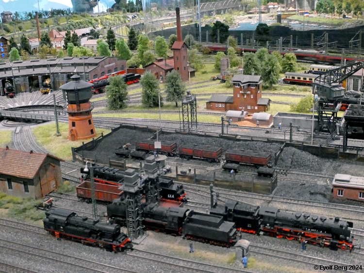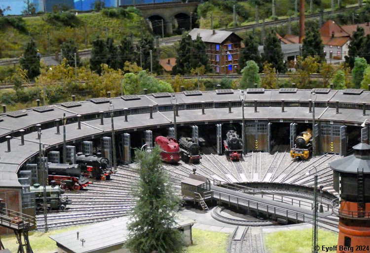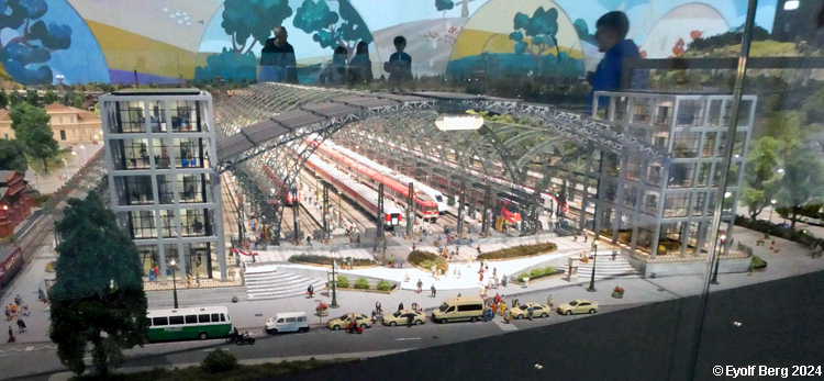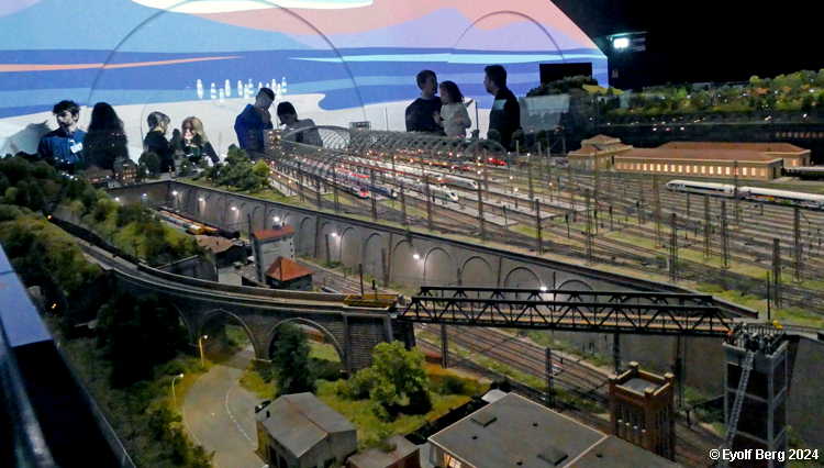 Hovedanlegget fyller, som sagt, mesteparten av den tidligere kinosalen. Du kan gå rundt anlegget et utall ganger og likevel oppdage nye detaljer hver gang. Landskapet kan best beskrives som circumalpint, en blanding av Sør-Tyskland og Nord-Italia, med noen innslag av Østerrike og Sveits. Broer, bymiljøer og stasjoner er stort sett hentet fra virkeligheten. Det er f.eks. ikke vanskelig å gjenkjenne sentralstasjonen i Milano i den store hovedstasjonen på anlegget - bortsett fra fasaden. Den er umiskjennelig Berlin Hauptbahnhof! Det rullend materiellet er like circumalpint som landskapet. Her kjøres tysk og italiensk, 15 kV vekselstrømsmateriell og 3 kV likestrømsmateriell om hverandre, med innslag av både Østerrike og Sveits (Nei, jeg så ikke noe fransk) - ja, endog en liten dæsj DDR! Og ulike tidsepoker kjøres likeledes om hverandre i en herlig blanding, med andre ord ikke noe for sarte feinschmeckersjeler. Men hva så? Det hele styres fra et kontrollrom som sies å være like avansert som fjernstyringssentralen på en moderne høyhastighetsjernbane.