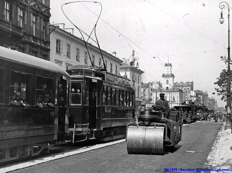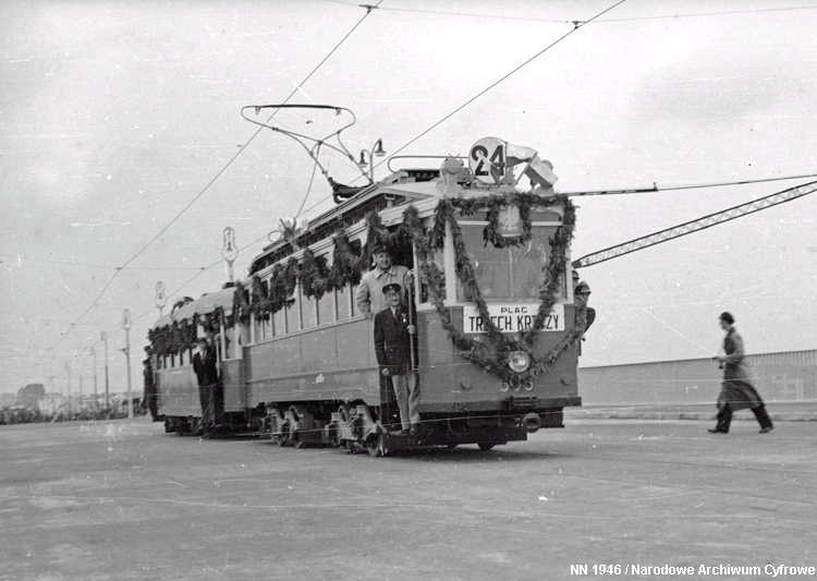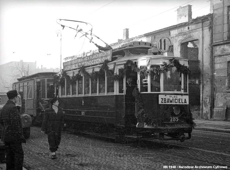 sporveiens infrastruktur måtte så å si bygges opp igjen fra grunnen av etter 2. verdenskrig. Samtidig var det en skrikende mangel på rullende materiell, og bredsporet sporvognsmateriell lot seg ikke uten videre skaffe. Warszawa benyttet derfor anledningen til å gå over fra russisk bredspor til normalspor. Det medførte at man kunne få tilført sporvogner som nødhjelp fra andre byer, bl.a. Breslau som nå var blitt polsk og het Wrocław. Samtidig var det enklere å omspore bredsporet materiell til normalspor enn omvendt, og etter hvert ble byens egne, overlevende trikker istandsatt og satt i trafikk på den nye sporvidden. En god hjelp var det også da man fikk tilbake de mange trikkene av type K, som okkupasjonsmakten hadde beslaglagt direkte fra fabrikk og sendt til den normalsporete sporveien i Berlin. Dette medførte at man klarte seg inntil den økonomiske og industrielle situasjonen i Polen og Warszawa igjen tillot produksjon og innkjøp av nye vogner fra 1949 og utover. 2-akslete vogner (stivrammevogner)
