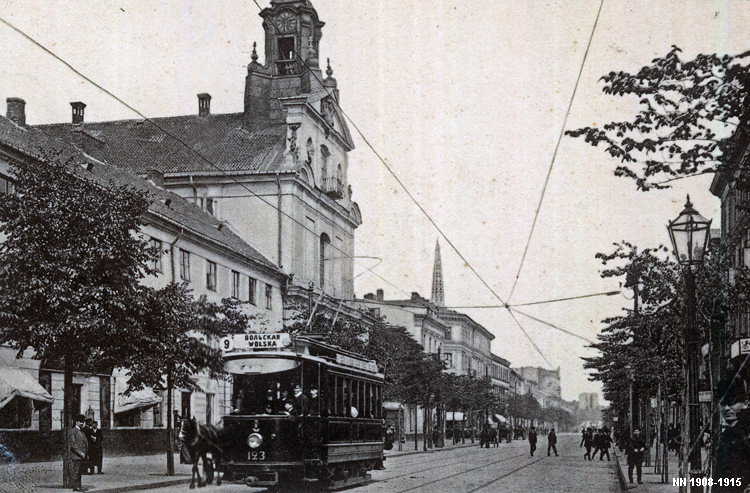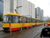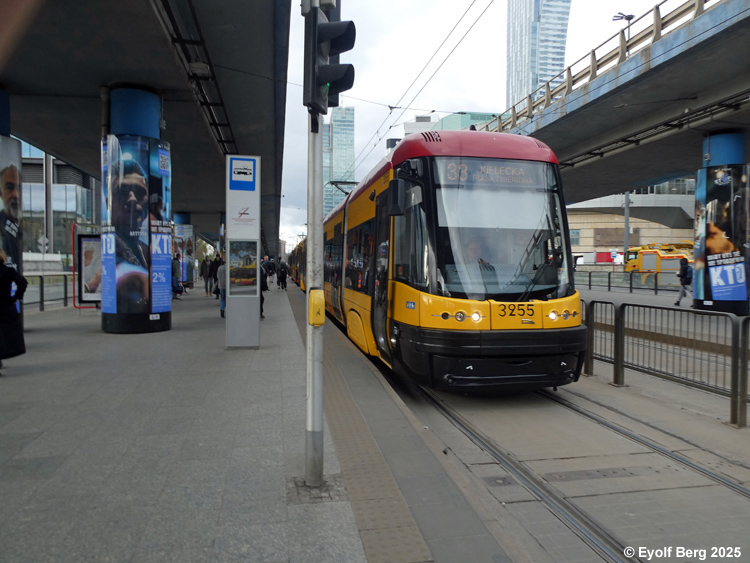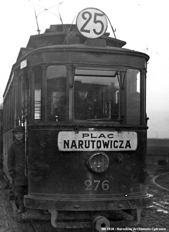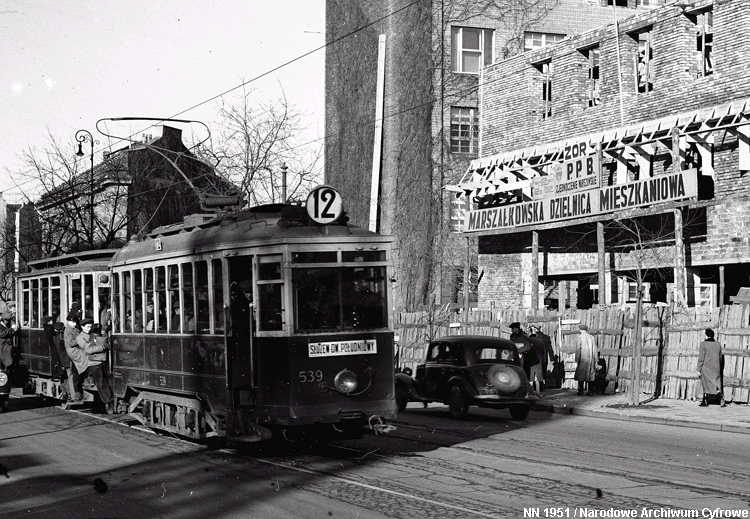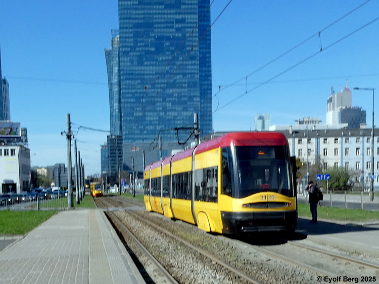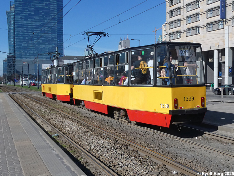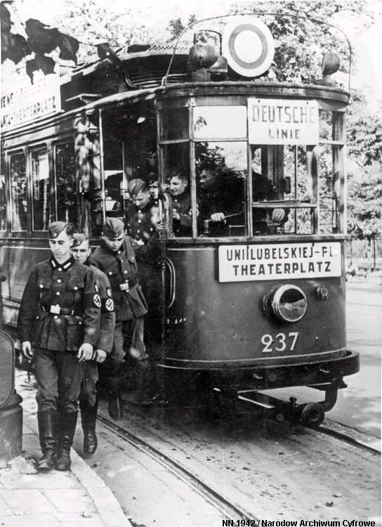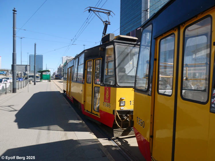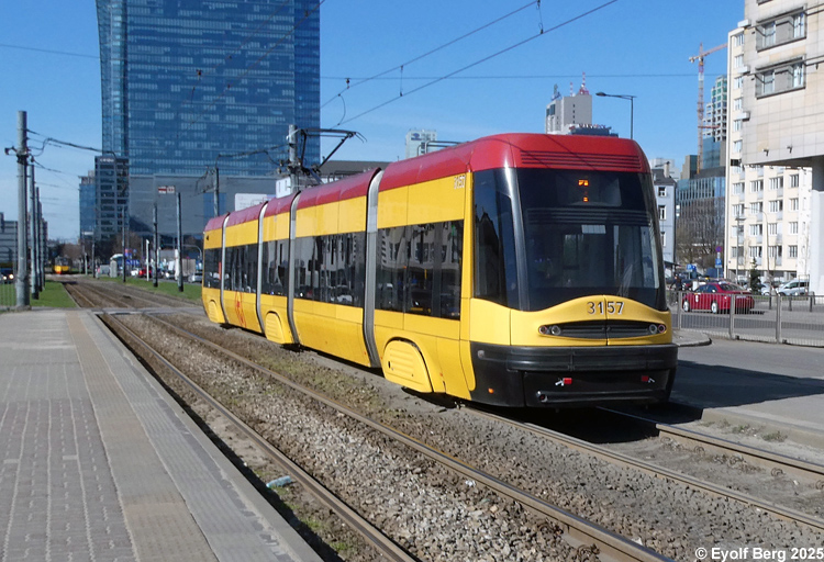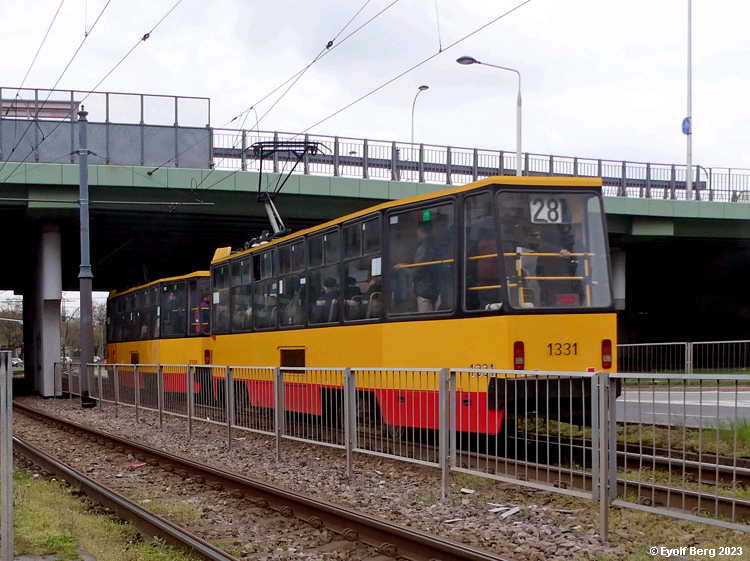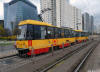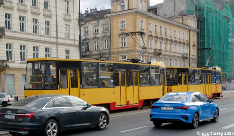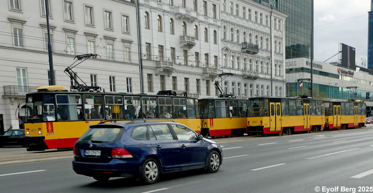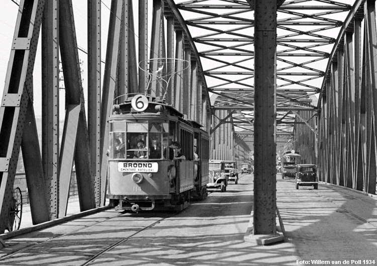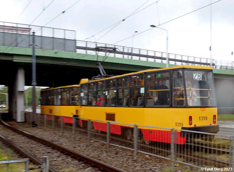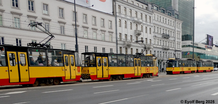 Warszawa Sporvei, t-bane og trolleybuss Likestrøm, 600 V (kontaktledning) Warszawas sporveishistorie begynte i 1866 da det ble åpnet en hestedrevet bane for person- og godstransport. Sporvidden var 1524 mm (russisk bredspor) som følge av at byen den gangen tilhørte det russiske imperiet. De russiske myndighetene vanskeliggjorde byggingen av sporveien ved bl.a. å forby byggingen av en bro over Wisła. Dette ble omgått ved at man benyttet en jernbanelinje for å krysse elven. Fram mot århundreskiftet vokste sporveisnettet kraftig, og i 1908 ble driften elektrifisert. Da Polen ble selvstendig etter første verdenskrig, skjøt utbyggingen av sporveisnettet fart etter femten års stagnasjon. Warszawa ble fullstendig rasert av den tyske okkupasjonsmakten under andre verdenskrig og måtte gjenoppbygges fra grunnen av etter krigen. Det gjaldt også sporveien, og i forbindelse med gjenoppbyggingen benyttet man samtidig anledningen til å gå over fra russisk bredspor til normalspor (1435 mm). Denne ombyggingen var fullført i 1950. Fra 1960 og utover stagnerte sporveisutbyggingen på ny, og enkelte linjer ble også nedlagt, denne gangen for å spare kull (Se nedenfor!). Fra 2005 har sporveien i Warszawa opplevd en ny blomstringsperiode med store investeringer i infrastruktur og rullende materiell. Flere nye linjer er blitt åpnet, og ytterligere utvidelser er under planlegging. Sammen med t-banen vil sporveien også i framtiden utgjøre ryggraden i byens kollektivtrafikk. Under den tyske invasjonen i 1939 ble sporveisnettet i Warszawa påført store skader. Mange av disse skadene ble ikke reparert før etter krigen. Da trafikken på den fremdeles kjørbare delen av nettet ble gjenopptatt, overførte de tyske okkupantene både infrastruktur og vognpark til et nytt, tyskeid firma, SVW. Etter opprettelsen av Warszawaghettoen i 1940 ble det etablert egne "jødetrikker" for å transportere ghettobeboerne mellom ghettoen og de tyskeide tvangsarbeidsplassene, bredrifter som produserte forsyninger for Wehrmacht. Disse trikkene var merket med en blå Davidsstjerne på hvit bakgrunn. Det var strengt forbudt for ikke-jøder å reise med disse vognene, og jøder hadde kun lov til å benytte disse vognene. Andre trikker som kjørte gjennom ghettoen, stoppet ikke der, og det var dødsstraff for ghettobeboere som prøvde å komme seg på dem. Etter hvert ble gaten sporveien gikk i, avsondret fra selve ghettoen med murer slik at den delte ghettoen i to deler. I tillegg opprettet okkupasjonsmakten en "Deutsche Linie". Denne var merket med en stor rød ring på hvit bakgrunn. Det var strengt forbudt og forbundet med streng straff for polakker å benytte disse vognene. Etter krigen var kun få av Warszawas sporvogner i kjørbar stand. Derimot fikk man tilbakeført et stort antall vogner av type K, som okkupasjonsmakten hadde beslaglagt rett fra fabrikken og sendt til den normalsporete sporveien i Berlin. Dette, sammen med de to kjensgjerningene at det meste av sporveiens infrastruktur likevel måtte bygges opp igjen fra grunnen av, og at det i fortsettelsen ville være både enklere og billigere å anskaffe normalsporet materiell enn bredsporet, førte til at bredsporets dager var talte. Det gikk bare ca. 4½ år innen den siste bredsporvognen kunne si takk for seg - dvs. at det gjorde de ikke. De ble omsporet og kjørte videre på den nye sporvidden.