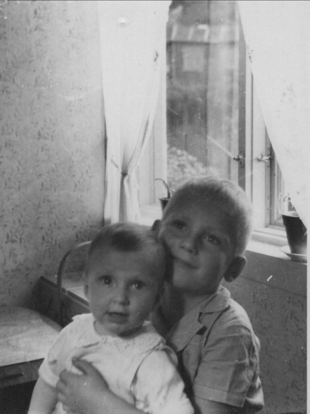 Torunn sammen med mor og storebror utenfor huset i Konows gt. på Kværner i Oslo