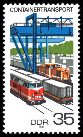 Motiv: Lukket godsvogn på havnespor og skinnegående havnekran |