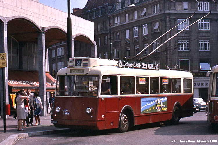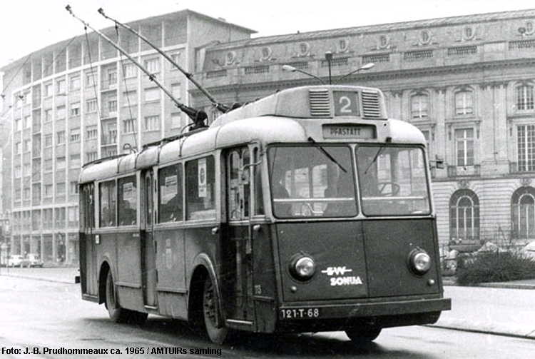 System Schiemann med to strømavtakerstenger Allerede før 2. verdenskrig hadde myndighetene i Mulhouse besluttet å erstatte den skinnegående sporveien med skinneløs. Krigen gjorde at denne prosessen ikke kom i gang før enn på slutten av 1940-tallet, og i 1947 begynte det for andre gang å kjøre trolleybusser i byen, denne gange med to strømavtakerstenger og normal avstand mellom kontaktledningene. Men som så mange andre steder ble også trolleybussen i Mulhouse rammet av den generelle motviljen mot miljøvennlig elektrisk kollektivtrafikk på 1950- og 1960-tallet, og i 1968 var det igjen slutt for den skinneløse sporveien i Mulhouse, bare 13 år etter nedleggelsen av den skinnegående den hadde erstattet. Da man på begynnelsen av 1990-tallet igjen begynte å diskutere sporvei i Mulhouse, var det igjen enkelte som ville satse på en skinneløs løsning. Dette ville i så fall ha blitt byens tredje trolleybussystem. En grundig utredning av byens behov tilsa imidlertid at man valgte å satse på skinnegående sporvei, og erfaringene etter gjenåpningen av sporveien i byen i 2006 tilsier at dette var en fornuftig beslutning. Til tross for sine store miljøfortrinn i forhold til busser med forbrenningsmotor, og for den saks skyld også i forhold til rene batteribusser, kan den skinneløse sporveien aldri klare å håndtere de passasjermengdene en skinnegående sporvei er i stand til å håndtere.
