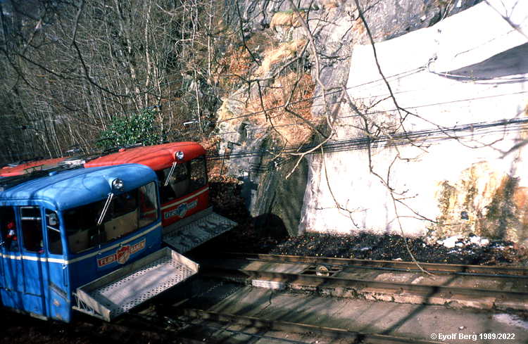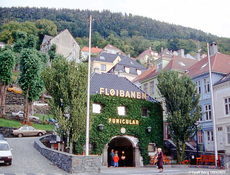 Fløibanens nedre stasjon ligger iøynefallende plassert øverst på Vetrlidsalmenningen og utgjør det østlige endepunktet av den brede øst-vest-aksen som av brannsikkerhetshensyn ble anlagt gjennom Bergen sentrum etter bybrannen i 1916. Johanneskirken utgjør det vestlige - og minst like iøynefallende - endepunktet. På store utfartsdager kan køen av folk som venter på å komme med, strekke seg langt nedover fortauet på høyre side. Antakelig var det 2. verdenskrig og den anstrengte valutasituasjonen i den første etterkrigstiden som medførte at Fløibanens første vogngenerasjon ble gående helt til 1954 før de ble skiftet ut. Dessverre er ngen av vognene fra 1917 bevart. 1954-vognene er antakelig de mest elegante vognene Fløibanen noensinne har hatt. Det var også disse som var min barndoms Fløibane. Understellene ble importert fra Sveits, men selve vognkassen ble levert av norske HøKa. Tanken var at begge disse skulle bevares, den ene ved Berges tekniske museum og den andre ved sporveismuseet "Vognhall 5" i Oslo. I ren uforstand ble den siste hogd opp da eierne av museet fant ut at den falt utenfor deres fokus. Hvor Bergens tekniske museum har gjort av sitt eksemplar, vet de forhåpentlig selv. På museet er den i hvert fall ikke. I 1974 kom tredje vogngenerasjon. Begge disse vognene er bevart ved Bergens tekniske museum. Neste utskifting var i 2002, etter en gjenomgående sanering av skinnegang og drivmaskineri. Nå var turistenes behov tydelig i sentrum på en helt annen måte enn tidligere. Vognene hadde store panoramavinduer og glasstak som ga godt utsyn både utover og oppover. Foreløpig siste vogngenerasjon ble satt i drift sommeren 2022. Se også (See also / Sehen Sie auch / Vea también / См. также):