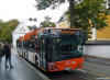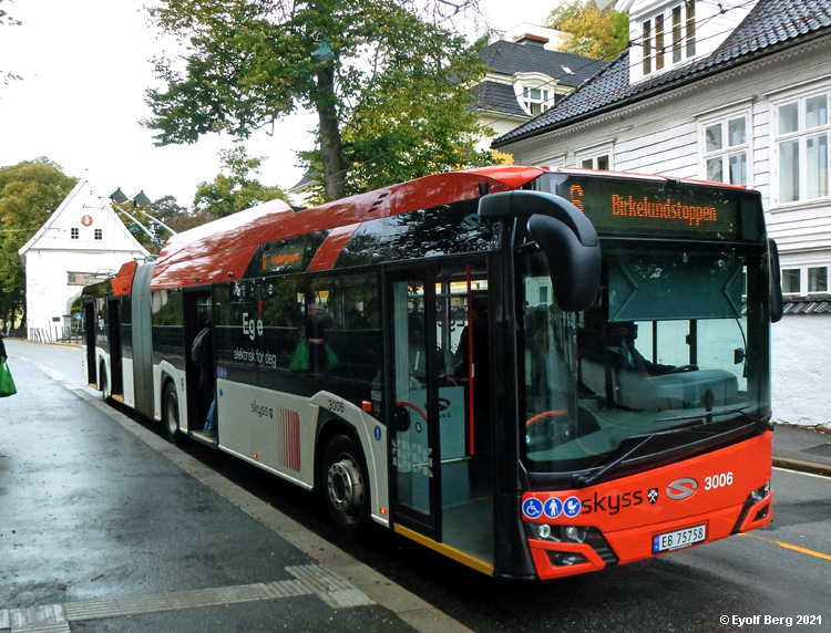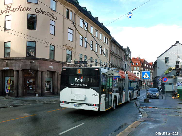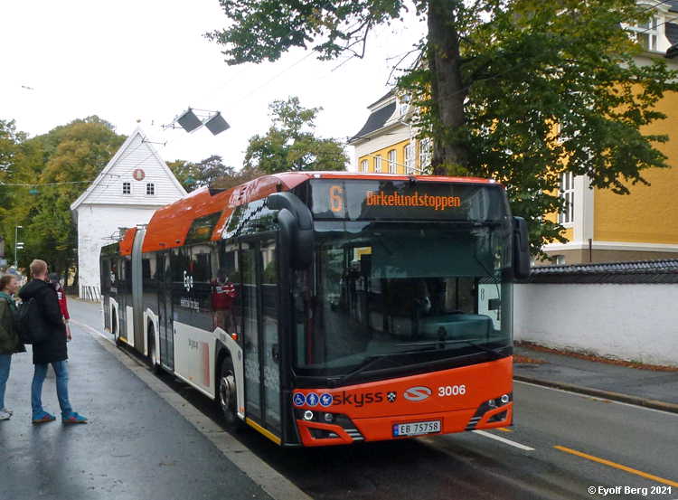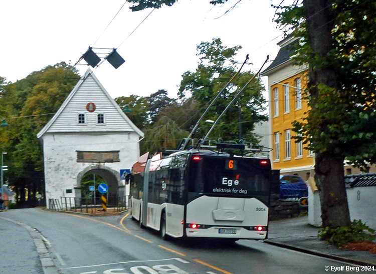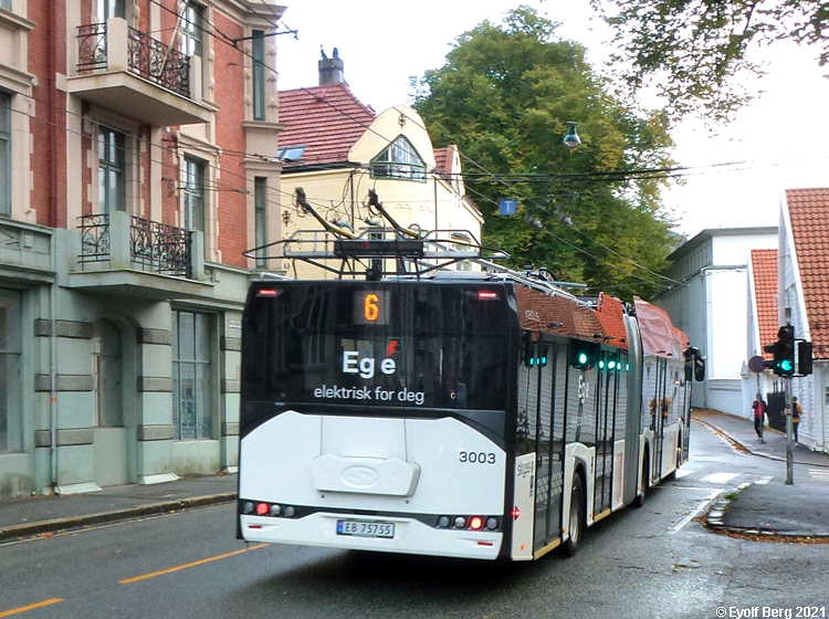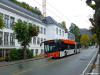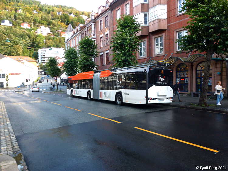 Likestrøm, 750 V (kontaktledning / akkumulator) I 2020 ble trolleybussdriften vesentlig utvidet i det det ble åpnet trolleybussdrift også vest for Puddefjorden. Gjennom sentrum ønsket man en fleksibel løsning uten kontaktledning, og det ble derfor anskaffet nye vogner som kjører på akkumulator gjennom sentrum1). Akkumulatorene lades når vognene kjører under kontaktledning. Det drøftes også å forlenge linjen ut over den elektrifiserte strekningen, spesielt på Natland, enten gjennom Sædalen til Nesttun eller over Fantoft til Paradis. Med denne teknologien burde det også være mulig å eliminere bruken av vanlige busser på linjen mellom Fyllingsdalen og Sletten, da denne i stor grad kjøres langs samme trasé som trolleybussene. Det samme gjelder linjen mellom Nordnes og Starefossen, men her vil det være nødvendig å anskaffe mindre vogner. Teknologien er på plass. Det er kun spørsmål om vilje til å satse. Trolleybusser med akkumulator har en stor fordel framfor rene akkumulatorbusser ved at de ikke må ha stasjonære ladeopphold. Det betyr at trolleybussen har langt mindre dødtid, i mange tilfeller også langt mindre tomkjøring, enn en ren akkumulatorbuss. En annen vesentlig fordel er at trolleybusser klarer seg med langt mindre - og lettere - akkumulatorer (batterier). Dette betyr at en trolleybuss vil ha vesentlig høyere passasjerkapasitet enn en ren akkumulatorbuss på samme størrelse.