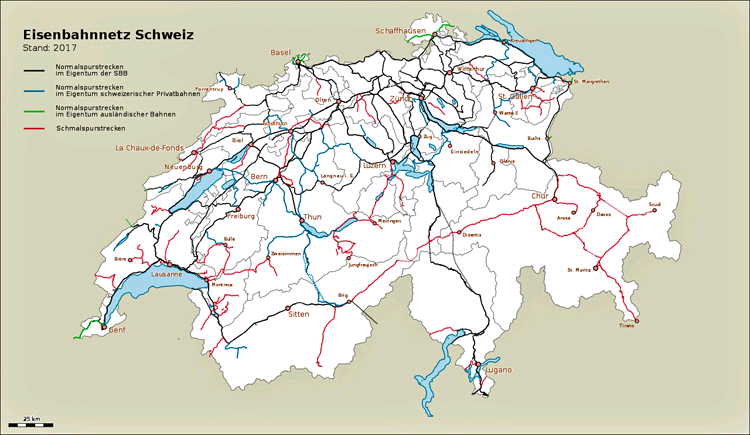 Vis en sveitser en fjelltopp, og han bygger umiddelbart en jernbane dit, har det vært påstått. Det er en sannhet med sterke modifikasjoner, men det er likevel påfallende hvor mange, livskraftige fjellbaner med kabel- og tannstangsdrift sveitserne har klart å bygge til ulike fjelltopper rundt om i landet. Den første jernbanen på sveitsisk jord, i 1844, var imidlertid ikke sveitsisk i det hele tatt. Det var en bane fra Strasbourg. Banen krysset grensen og hadde sitt endepunkt i Basel på sveitsisk side. I de påfølgende 100 årene skulle denne banen komme til å være vekselvis fransk og tysk, alt etter hvorvidt Alsace og Lorraine tilhørte Frankrike eller Tyskland. Først tre år senere ble den første helsveitsiske jernbanen åpnet, mellom Zürich og Baden, og fra da tok jernbanebyggingen i Sveits for alvor av. Begge disse første banene var bygget med normalspor-, og denne sporvidden ble dominerende for alle senere stamstrekninger i Sveits. Riktignok har senere noen lokale smalsporbaner (meterspor - 1000 mm sporvidde) utviklet seg til noe som nærmest må kalles stambaner, men de er likevel unntakene. Den første jernbaneloven foreskrev at jernbanene skulle bygges av private eller av lokale myndigheter, noe som medførte en sterk konkurranse med flere konkurrerende strekninger og påfølgende konkurser. Først i 1909 ble de fem største jernbaneselskapene samlet i et statsbaneselskap. Den språkpolitiske situasjonen i Sveits innebærer at statsbaneselskapet har flere betegnelser. Fordi tysk er flertallsspråket som brukes av 65,6 % av befolkningen, er den tyske betegnelsen SBB (Schweizerische Bundesbahnen) gjennomført på disse sidene (og tilsvarende for andre flerspråklige selskaper). På fransk er betegnelsen CFF (Chemins de fer fédéraux suisses), på italiensk FFS (Ferrovie federali svizzere) og på retoromansk VFS (Viafiers federalas svizras). Fremdeles finnes det en rekke private jernbaneselskaper, først og fremst lokale baner, men også to store, BLS som bl.a. driver den transalpine linjen til Italia over Simplon, og den metersporige RhB. Grunnet sin sentrale plassering i Europa utviklet Sveits seg allerede tidlig til å bli et viktig transittland for både person- og godstrafikk, og sveitsisk ingeniørkunst sto for flere banebrytende bragder i arbeidet med å krysse Alpene og binde sammen nord og sør. Spesielt for godstrafikken spiller transittrafikken en større rolle i vår tid enn noen gang tidligere, og kapasiteten er i senere år bygget kraftig ut med nye basistunneler på flere av de viktige transalpine strekningene. Sveits har grensekryssende trafikk til samtlige naboland, og selv noen innersveitsiske linjer krysser faktisk grensen flere ganger, et resultat av at grensene flyttet seg flere ganger på 1800-tallet. Det finnes endog grensekryssende smalsporbaner.