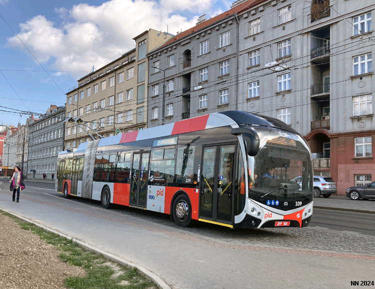Likestrøm, 750 V (system Schiemann, 2 stenger / akkumulator)1) Den nye skinneløse sporveien benytter vogner som dels kjører under kontaktledning, dels på akkumulatordrift. Trolleybussen har den fordelen framfor rene akkumulatorbusser at de lades under kjører og dermed unngår driftsopphold for lading. I tillegg hadde rene akkumulatorbusser allerede vist seg uegnede i en by med så mange, sterke stigninger som Praha. Trolleybussen byr derimot på den ideelle løsningen for en miljøvennlig, skinneløs kollektivtransport på de linjene som ikke har trafikkgrunnlag for skinnegående løsninger - foruten at trolleybussen heller ikke krever så tunge akkumulatorløsninger som rene akkumulatorbusser og vil dermed ha større passasjerkapasitet.2)