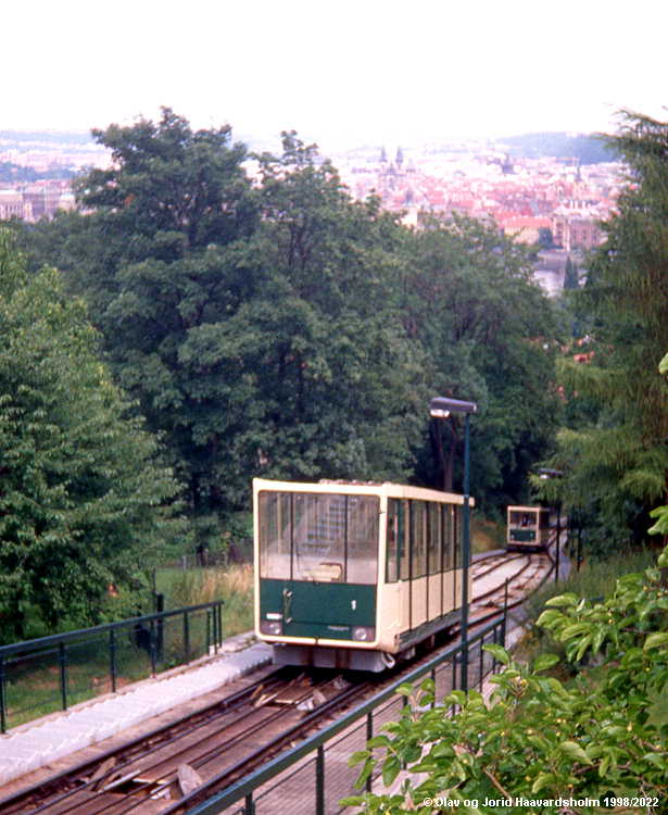 Kabelbanen fra Praha sentrum til toppen av Petřín-fjellet ble åpnet så tidlig som i 1891. Byen var den gang hovedstad i Böhmen, en provins under dobbeltmonarkiet Østerrike-Ungarn, og fjellet het Laurenziberg. Sporvidden var 1000 mm (meterspor), og sporet var lagt med tre skinner, der begge vogner benyttet midtskinnen, med unntak av krysningssporet på midten, som var tilnærmet lik det man finnet på de fleste av vår tids kabelbaner. Banen ble drevet ved at en tank i nedadgående ble fylt med vann og trakk ved hjelp av vekten den andre vognen opp. Det sier seg selv at det gikk med store mengder vann til å drive banen. Under 1. verdenskrig ble driften innstilt, ikke pga. krigsskader, men fordi krigshandlingene krevde både betjening og (mannlige) passasjerer til fronten. Alvorlig vannmangel på begynnelsen av 1920-tallet gjorde at det nå selvstendige Tsjekkoslovakia ikke så seg i stand til å gjenoppta driften, og banen forfalt. Da det på begynnelsen av 1930-tallet omsider ble aktuelt å gjenåpne banen, var forfallet kommet så langt at både vogner og infrastruktur måtte saneres totalt. I 1932 ble banen gjenåpnet, nå med normalspor (1435 mm), elektrisk drift og normalt enkeltspor med krysningsspor på midten. Grunnforholdene i Petřín-fjellet har vist seg ustabile, og store mengder vann i fjellet har vært et vedvarende problem for banen. Dette førte til at driften igjen måtte innstilles i perioden 1965-1985. Problemene anses nå som løst, og banens framtid synes å være sikret. Den er en særdeles populær utfluktsbane for både fastboende og turister. Bildene er tatt i juli 1998.