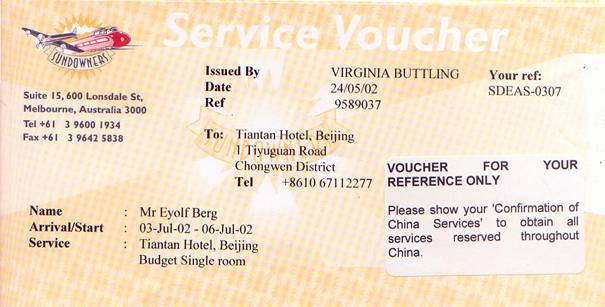 Billettbekreftelse (voucher) fra Sundowners. Bortsett fra i Kina der vi skulle forevise et kinesiskspråklig skriv, skulle voucherne leveres til tjenesteytende instans underveis, men det var slett ikke alle som brød seg med å ta dem inn.